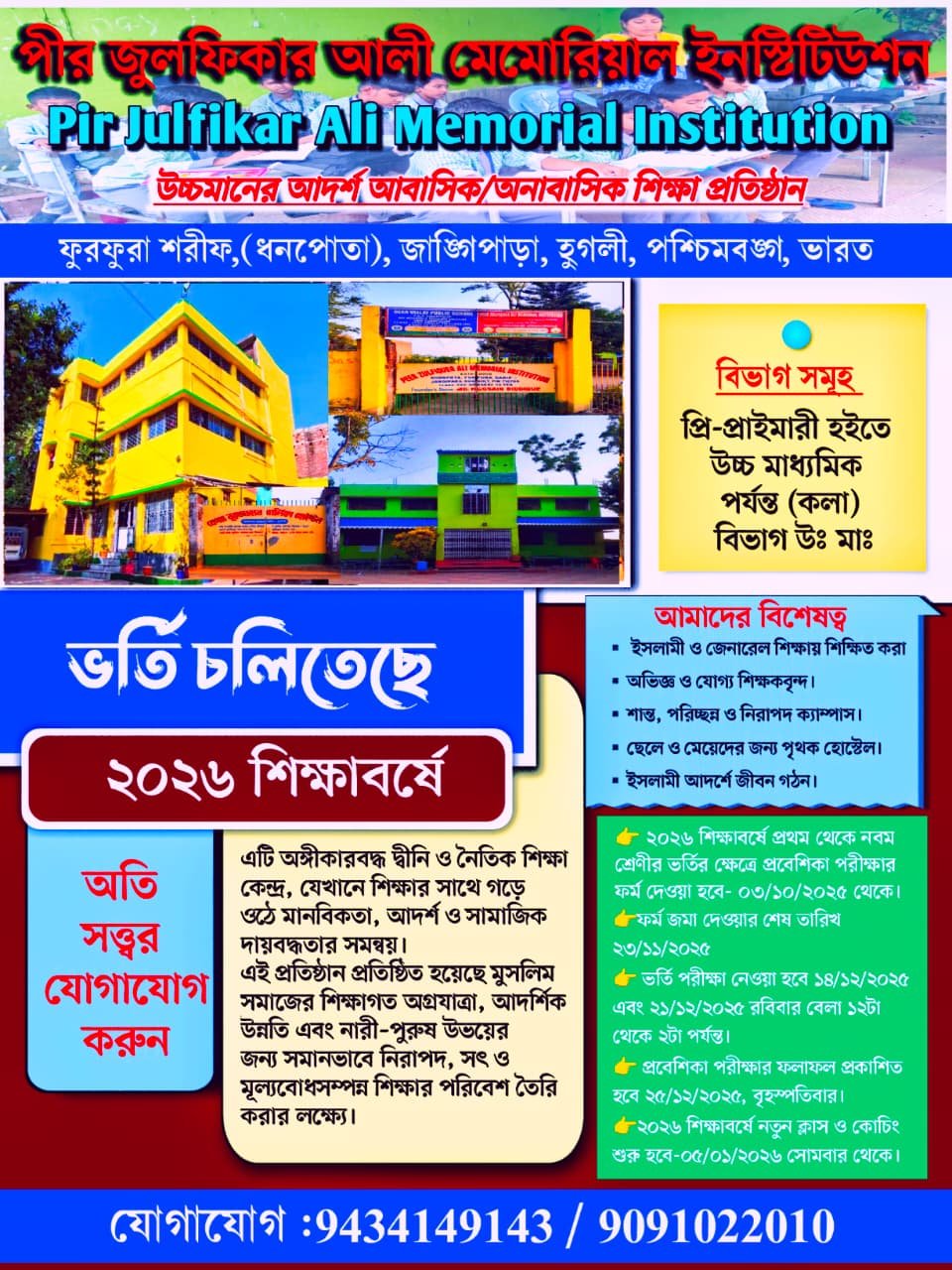 পীর জুলফিকার আলী মেমোরিয়াল ইনস্টিটিউশন একটি স্বনামধন্য ও মানসম্মত ইসলামী-আদর্শ ভিত্তিক আধুনিক শিক্ষাপ্রতিষ্ঠান। এখানে ছাত্র–ছাত্রীদের নৈতিক, চারিত্রিক ও আধুনিক শিক্ষার সমন্বিত পরিবেশ তৈরি করা হয়েছে। শিক্ষার পাশাপাশি আদর্শবান, সময়ানুবর্তী ও সমাজবান্ধব নাগরিক তৈরিই আমাদের মূল লক্ষ্য।